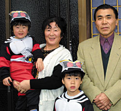 平沢幼稚園年長の貴成(たかなり)くんと、3歳の誉央(のりちか)くんに囲まれ「毎日元気な孫たちと、楽しく暮らしています」と語る奥平常男さん、リエコさん夫婦。(小村崎東)