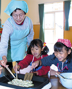 10月29日、地域の小学生を対象に、永野児童館で開かれた「楽しいクッキング」で調理指導を行った我妻秀会長(写真左)は「講習会などをとおして『食』の大切さ、楽しさを一人でも多くの人に伝えていくことができたらと思っています。とくに子どものときの食事が一生の食習慣に大きく影響するといわれているので、子育て中の若い世代の人たちが、料理の楽しさや素材の風味をいかした薄味のおいしさを味わう機会を増やしていけたら」と話していました。