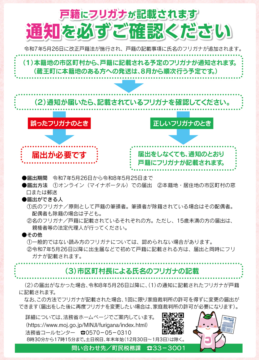 戸籍にフリガナが記載されます。通知を必ずご確認ください