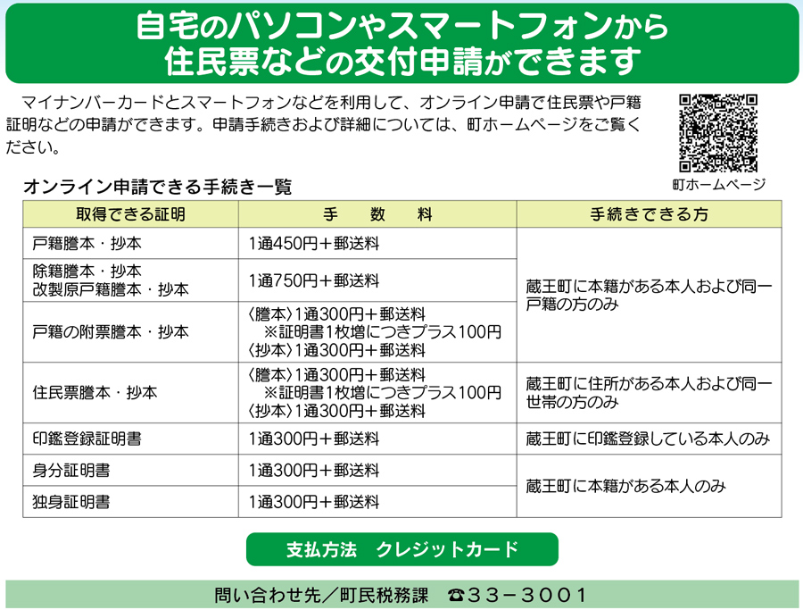 自宅のパソコンやスマートフォンから住民票などの交付申請ができます