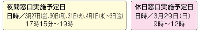 | 年度末・年度初め 町民税務課 夜間窓口および休日窓口開設(要予約) |