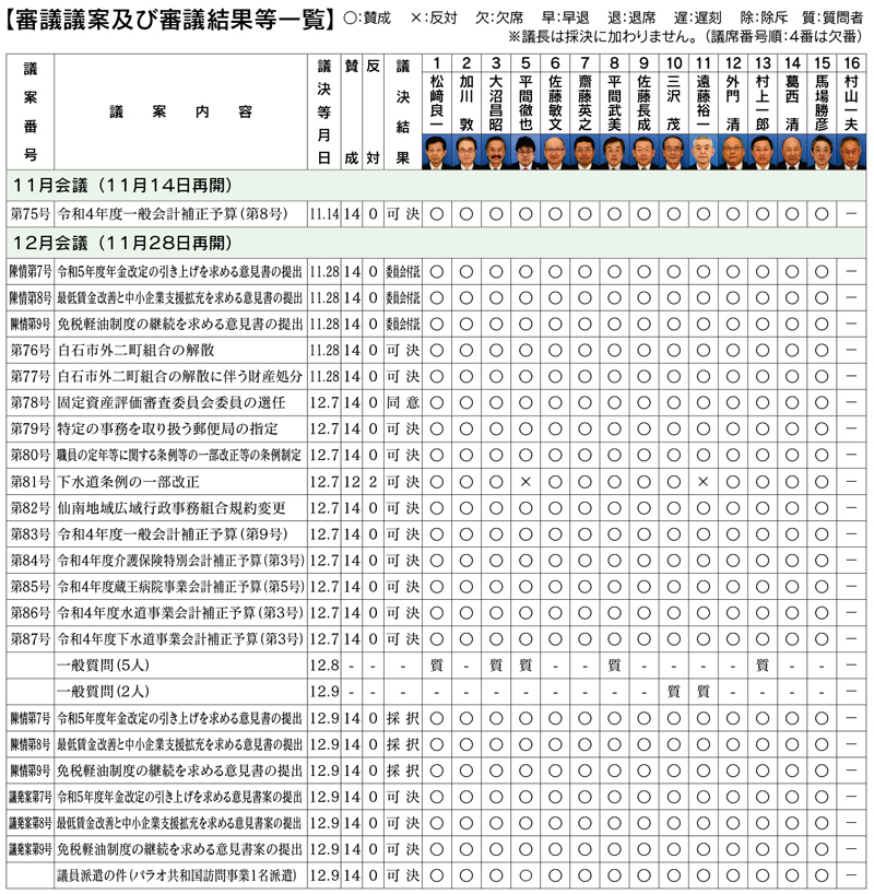 令和4年 11月会議・12月会議 蔵王町議会は通年議会制のため、令和4年1月4日に町長が招集し、令和4年定例会の会期を12月28日までの359日間としました。