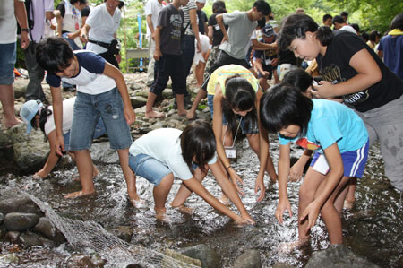 歓声を上げながらニジマスを追いかける豊渓小と永野小の児童たち