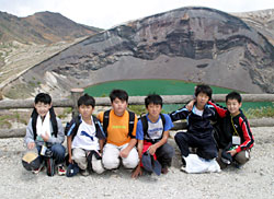 御釜をバックにグループごとに記念撮影