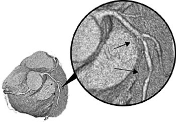心臓の血管に2か所狭さく(矢印)を認めた。