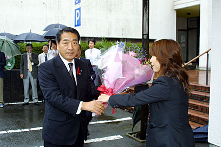 10月6日、小雨が降る中、役場庁舎に初登庁。町職員から歓迎の花束を受け取る村上英人町長