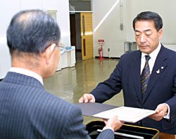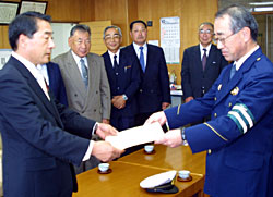 白石警察署長から祝詞を受け取る村上町長