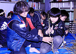 地域の人たちの指導で縄ないを体験する児童