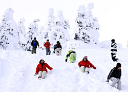 ほとんど風もない穏やかな快晴の下、樹氷原で雪遊びをする生徒たち