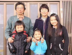 円田小学校4年の里音(りおん)ちゃんと2年の健心(けんしん)くん、円田幼稚園年少の志音(しおん)ちゃんを前に「毎日、元気な孫たちとにぎやかに楽しく暮らしています」と語るのは、佐藤亀久雄さんと惠美子さんご夫婦。(塩沢)