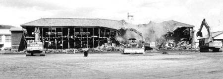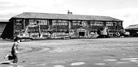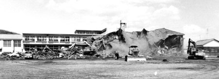 木造校舎の解体が進むと、後ろに建つ新校舎が現れてきます(昭和56年3月17日)