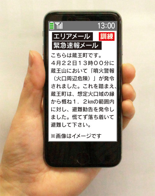 ※緊急速報メールを登録している方に、今回の火山防災訓練メールが届きますが、あくまで「訓練」ですので災害と誤解しないよう、周りの方にもお知らせいただくようお願いします。