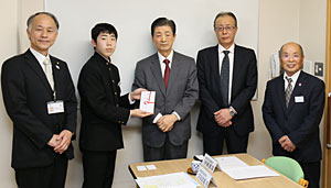 「太平洋あしなが基金事業」(蔵王町社会福祉協議会設置)を通して、各小中学校へ図書・書棚セットに活用していただきたいと、本基金の賛同者、村上洋二さんと河上勉さんから、代表の佐藤颯太さん(円田中学校2年生)に2,000,000円の目録が贈呈されました。 町社会福祉協議会へ 株式会社太平洋インベストメント 様(仙台市)1,000,000円 宗教法人清水沢百合沢大鷹沢三沢山辨財天不動尊主管堂宮大照 様(白石市)11,000円 佐藤修一さん(円田表)100,000円