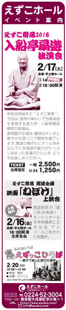 ・障害者控除対象者認定書を交付しますせ ・スノートレッキング開催 ・B&G会長杯スポーツ交流大会 ・冬の運動不足解消に ・親子で職場体験IN蔵王福祉の森構想 開催 ・Mama Cafe“ミニお雛さまづくり&お茶会” ・第8回 のうかつ交流会 ・6次産業化相談 ・町営住宅入居者募集 ・就学援助制度 ・えずこホールイベント案内