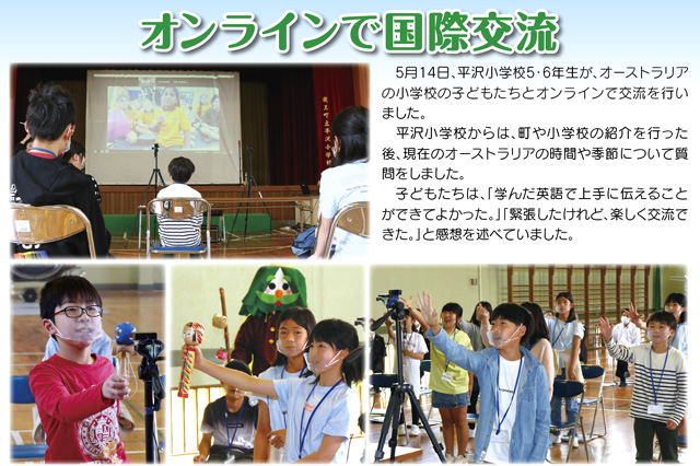 平沢小学校では、5・6年生が国際交流プログラムとして年に4回、外国に住む大学生や小学生とオンラインで交流する学習があります。第1回目はオーストラリアに住む大学生と交流しました。私たちは英語で自己紹介や学校紹介、蔵王町の紹介をしました。初めて外国に住む人との会話で緊張しましたが、たくさん練習をしてきたのでなんとかやり取りをすることができました。