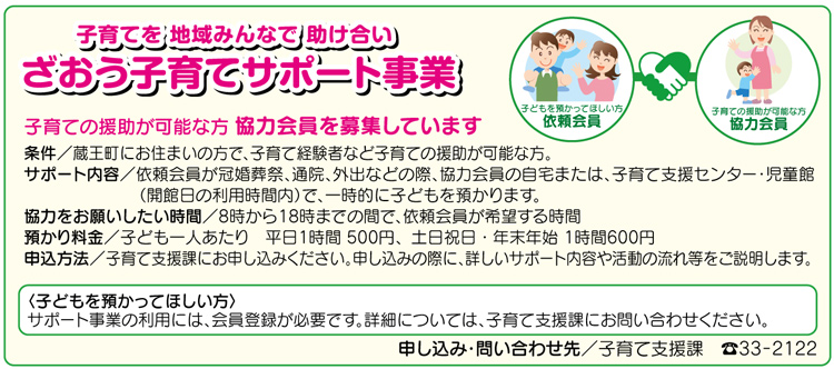| 子育てを 地域みんなで 助け合い ざおう子育てサポート事業 |