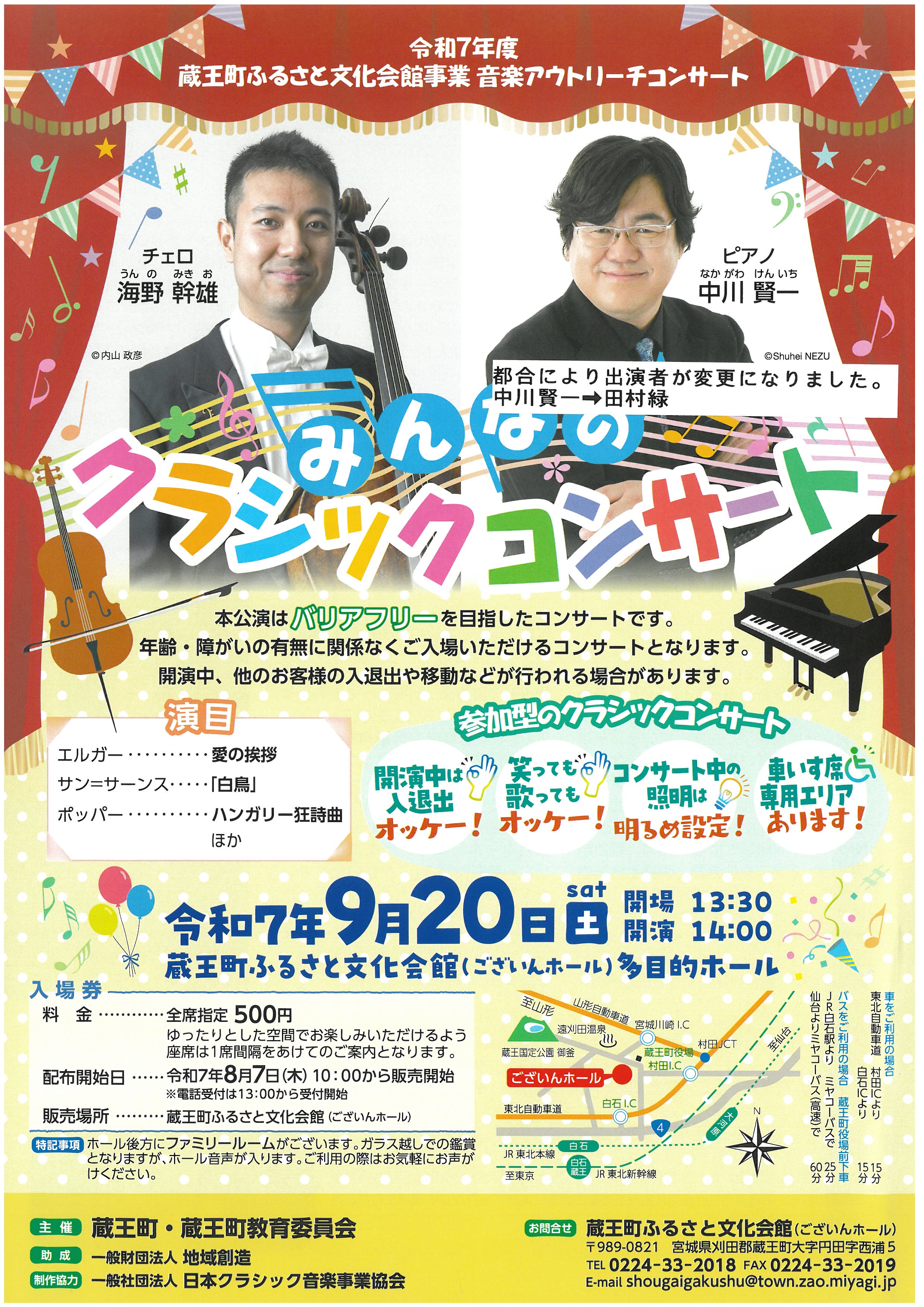 バリアフリーコンサートは海野春絵さんが、みんなのクラシックコンサートは田村緑さんがそれぞれ中川賢一さんに代わり出演いたします。
