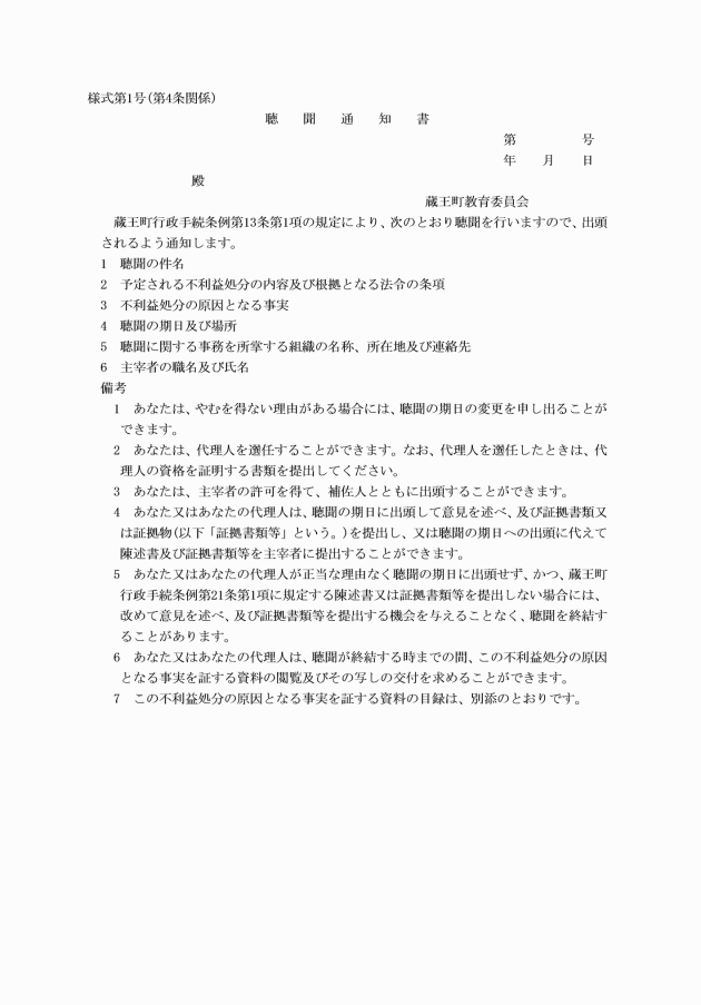 第1条 この規則は、蔵王町教育委員会及びその権限に属する事務を委任された者が蔵王町行政手続条例(平成8年蔵王町条例第18号。以下「条例」という。)第3章の規定に基づいて行う聴聞及び弁明の機会の付与に関し必要な事項を定めるものとする。
