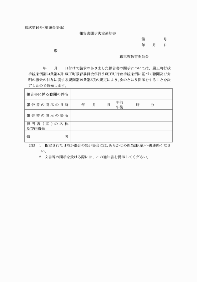 第19条 聴聞調書の開示の請求をしようとする当事者又は参加人は、聴聞調書開示請求書(様式第13号)を、聴聞の終結前にあっては主宰者に、聴聞の終結後にあっては行政庁に提出しなければならない。