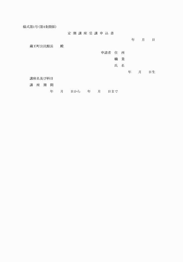 第4条 公民館が開設する定期講座を受講しようとする者は、定期講座受講申込書(様式第1号)を館長に提出し、その許可を受けなければならない。