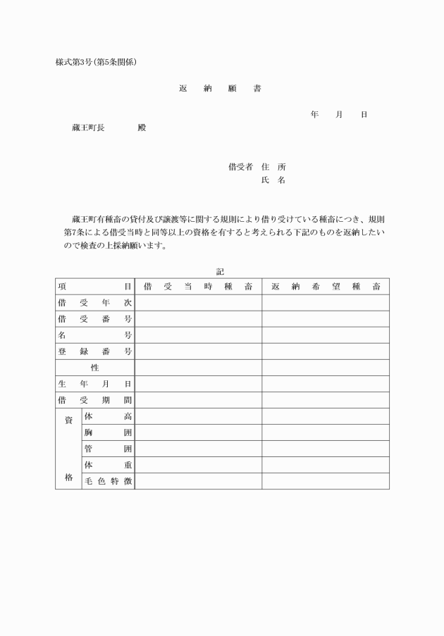 第1条 蔵王町有種畜の貸付及び譲渡等に関する規則(昭和47年蔵王町規則第8号。以下「規則」という。)に基づき、町有種畜の貸付及び譲渡に関しては、この規程の定めるところによる。