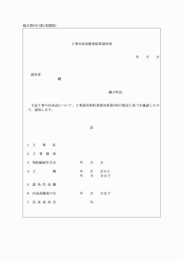 第1条 蔵王町建設工事執行規則(平成8年蔵王町規則第20号)の規定により工事請負契約書、変更契約書等の様式を次のように定める。