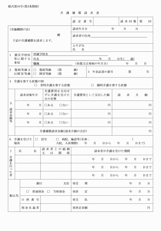 第4条 補償(現に受けている補償の額の変更を含む。以下この条及び第5条において同じ。)を受けようとする者は、次の各号に掲げる受けようとする補償の種類に応じ、当該各号に定める補償請求書を、学校医等が所属している学校(学校医等が死亡し、又は離職した場合においては、その死亡又は離職の直前に所属した学校)の校長を経由して教育委員会に提出しなければならない。ただし、公立学校の学校医、学校歯科医、及び学校薬剤師の公務災害補償の基準を定める政令(昭和32年政令第283号。以下「政令」という。)第3条第2項に規定する医療機関若しくは薬局(以下「指定医療機関」という。)において療養を受ける療養補償については、当該指定医療機関を経由しなければならない。