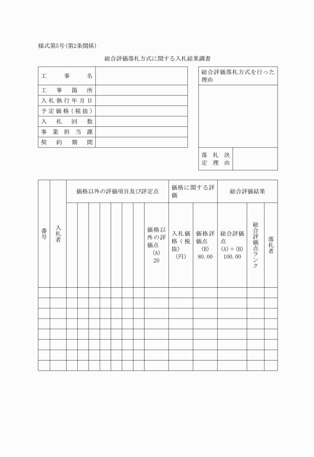 第4条 登録全業者の中から最終的な指名業者選定に至るまでの具体的な絞り込み条件を、その段階毎に記載する。また、工事ランク外の業者を選定した場合は、その理由書を記載する。その場合、建設工事指名競争入札参加指名基準の該当条項を記載する。