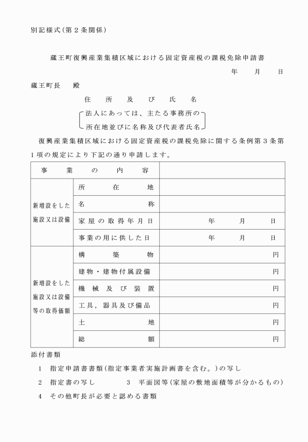 第1条 この規則は、復興産業集積区域における固定資産税の課税免除に関する条例(平成24年蔵王町条例第17号。以下「条例」という。)の施行に関し必要な事項を定めるものとする。