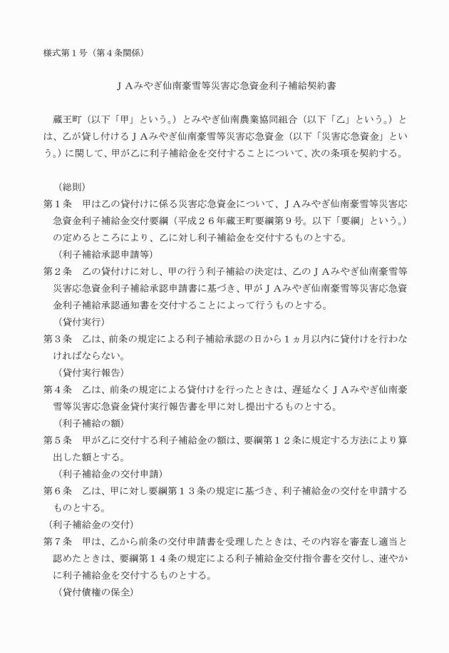 第4条 農協が災害応急資金を貸し付けるときは、事前に当該貸付についての利子補給契約をJAみやぎ仙南豪雪等災害応急資金利子補給契約書(様式第1号)により、町長と締結するものとする。