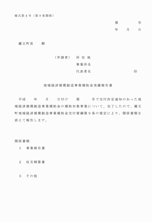 第9条 補助事業者は、事業が完了したときは、その日から起算して30日以内又は補助金の交付の決定を受けた日の属する年度の末日のいずれか早い日までに、地域経済循環創造事業補助金実績報告書(様式第4号)を町長に提出しなければならない。