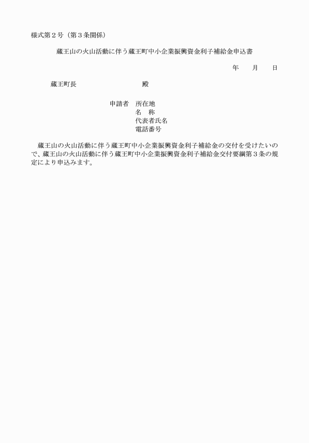第3条 利子補給金の交付を申し込む者は、蔵王町中小企業振興資金融資制度要綱(平成19年蔵王町要綱第2号)第3条に定める蔵王町中小企業振興資金融資あっせん申込書に、利子補給金申込書(様式第2号)及び前条第1号の規定による認定書を添付しなければならない。