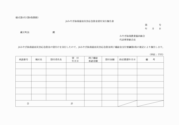 2 農協は、災害応急資金の貸し付けを行った場合は、遅滞なくJAみやぎ仙南豪雨災害応急資金貸付実行報告書(様式第4号)を町長に提出するものとする。