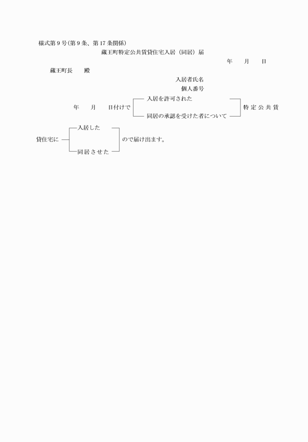 第14条 条例第20条ただし書の規定による承認を受けようとする入居者は、特定公共賃貸住宅用途変更承認申請書(様式第12号)を町長に提出しなければならない。