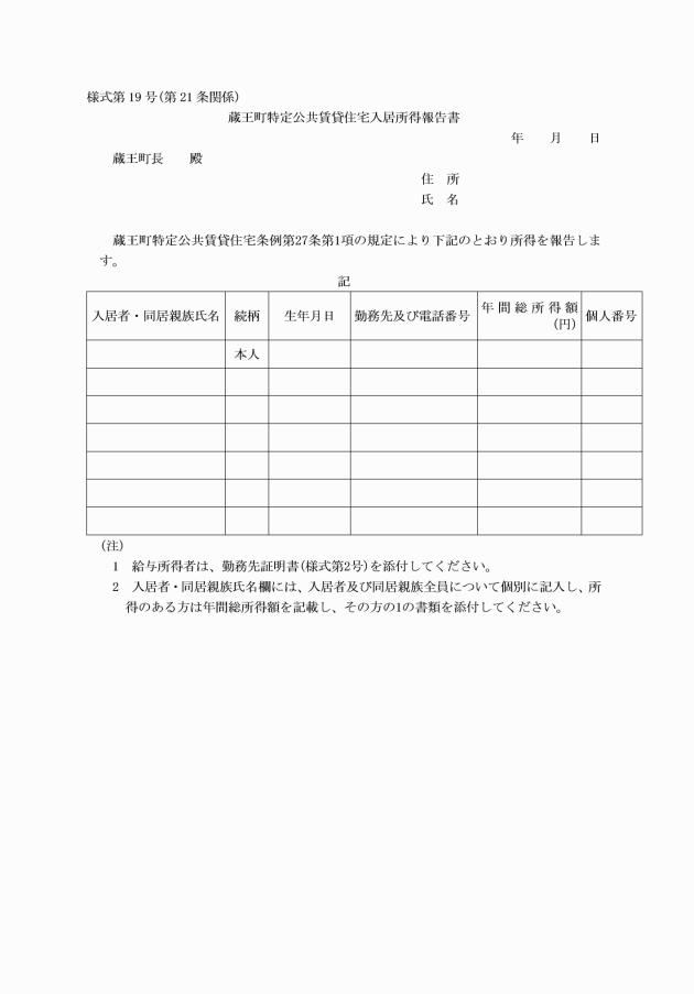 4 入居者は、同居親族の氏名に変更があったとき又は同居親族が同居しなくなったときは、7日以内に特定公共賃貸住宅同居親族異動届(様式第15号)を町長に届け出なければならない。