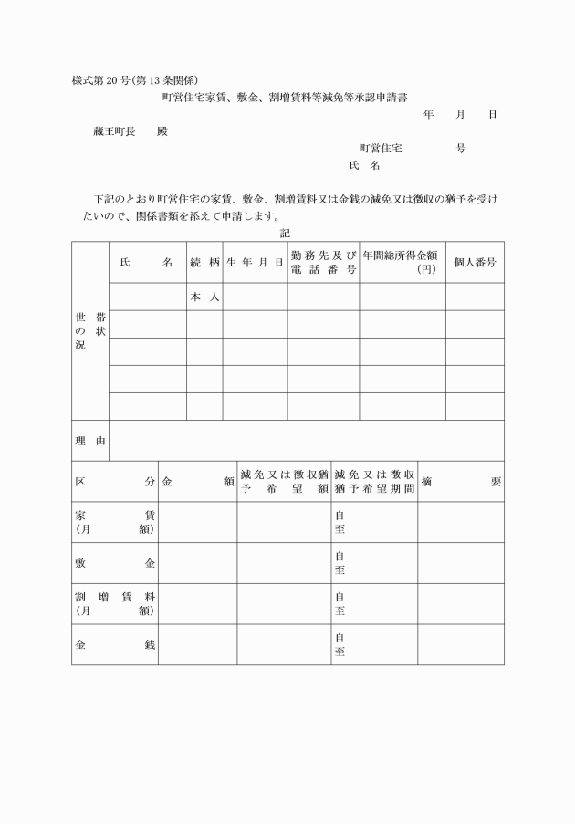 第17条 条例第25条ただし書の規定による承認を受けようとする入居者は、町営住宅用途変更承認申請書(様式第24号)を町長に提出しなければならない。