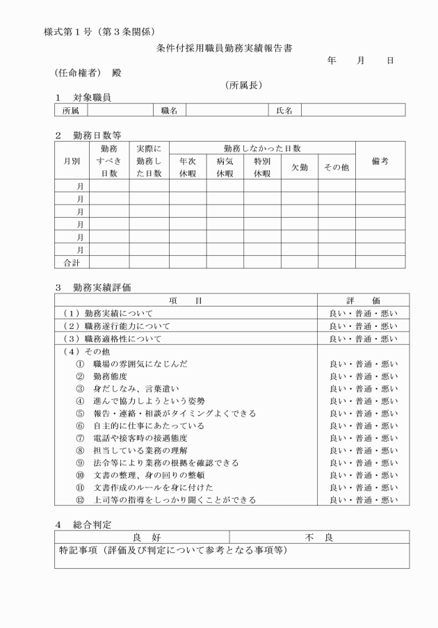 第3条 条件付採用期間中の職員の所属長は、条件付採用期間の終了14日前までに、条件付採用職員勤務実績報告書(様式第1号)により、その者の勤務実績その他必要な事項について、総務課長を通じて任命権者に報告しなければならない。
