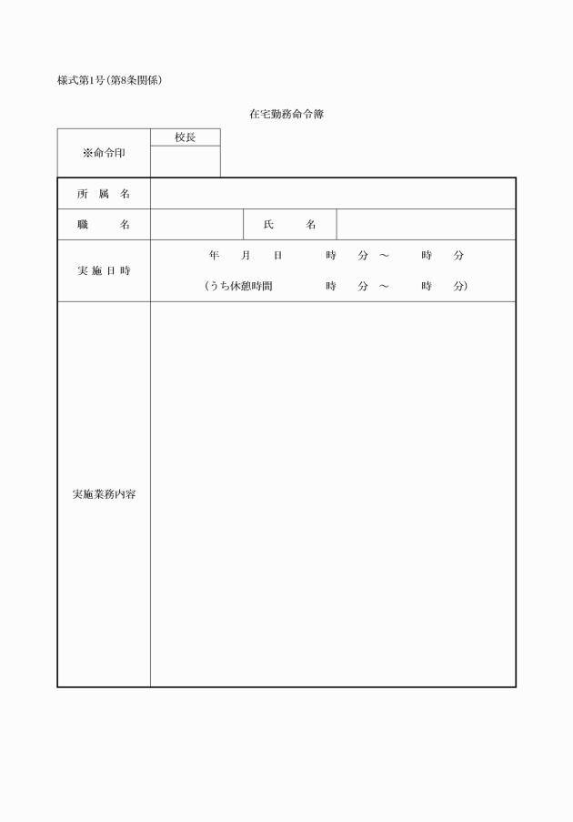 第8条 校長は、実施職員に対し、あらかじめ在宅勤務で従事する業務及び在宅勤務日(1時間単位で在宅勤務を命ずる場合は、在宅勤務時間)を指定し、この実施要領の内容について実施職員の理解を得た上で、在宅勤務命令簿(様式第1号)により在宅勤務を命ずるものとする。