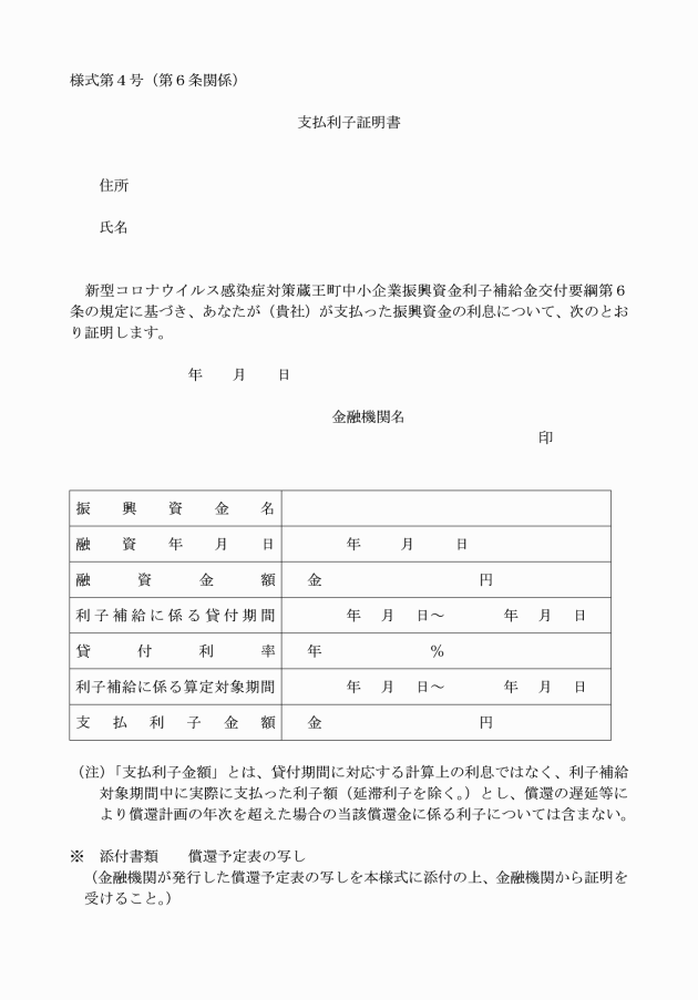 (4) 融資を行った金融機関が発行する支払利子証明書(様式第4号)