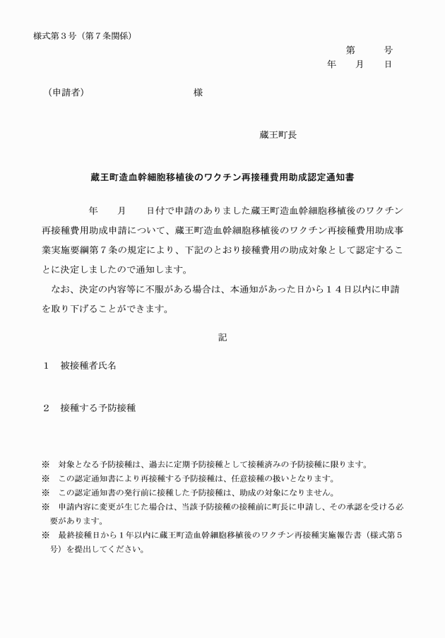 第13条 決定通知書を受けた助成認定者は、当該通知のあった日から1月以内に蔵王町造血幹細胞移植後のワクチン再接種費用助成金請求書(様式第7号)に、助成金振込先口座が確認できる書類の写しを添えて、町長に提出しなければならない。
