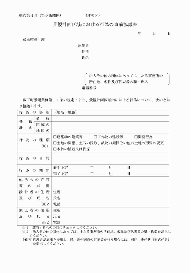 第4条 法第16条第1項の規定による届出は、景観計画区域における行為の届出書(様式第1号)により行うものとする。