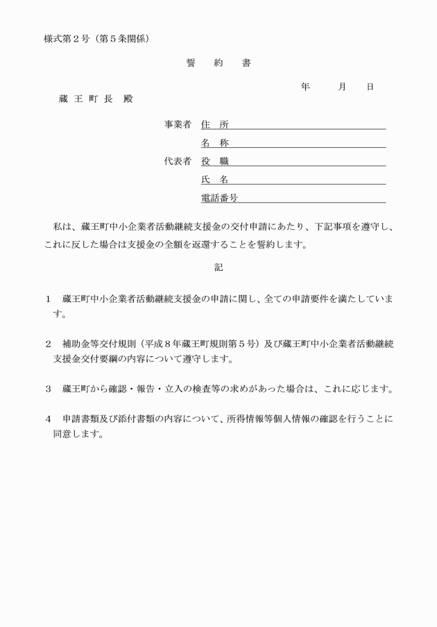 第5条 支援金の交付を受けようとする者(以下「申請者」という。)は、蔵王町中小企業者活動継続支援金交付申請書兼請求書(様式第1号)に次に掲げる書類を添えて町長に申請するものとする。