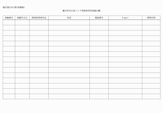 第7条 利用希望者が、空き家バンクの情報提供を受けようとするときは、蔵王町空き家バンク利用希望者登録申請書(様式第10号。以下「利用登録申請書」という。)に町長が必要と認める書類を添付して提出しなければならない。