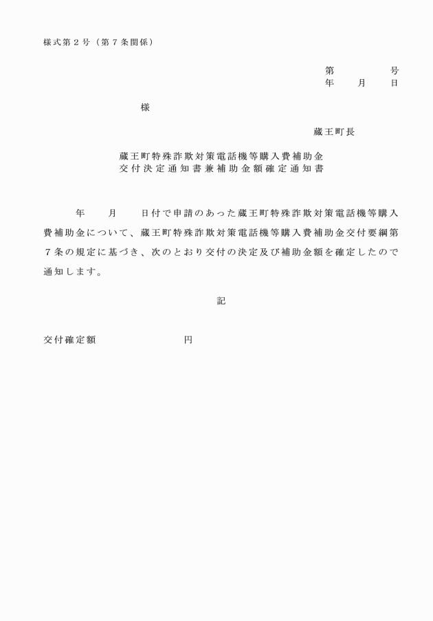第6条 補助金の交付を受けようとする者(以下「申請者」という。)は、電話機等を購入した年度内に、蔵王町特殊詐欺対策電話機等購入費補助金交付申請書兼請求書(様式第1号)に次に掲げる書類を添えて、町長に提出しなければならない。
