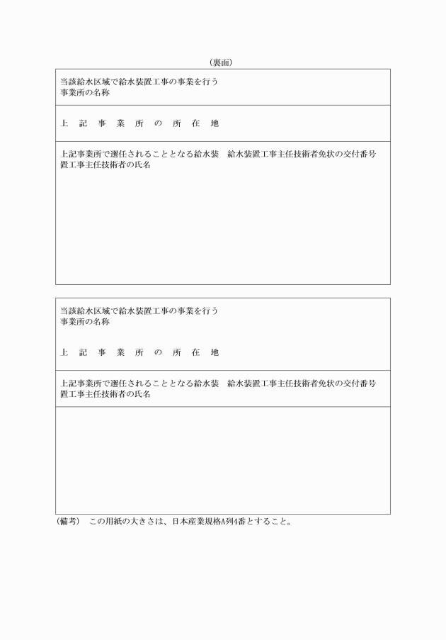 第4条 給水条例第10条第1項の規定は、給水装置工事の事業を行う者の申請により行う。